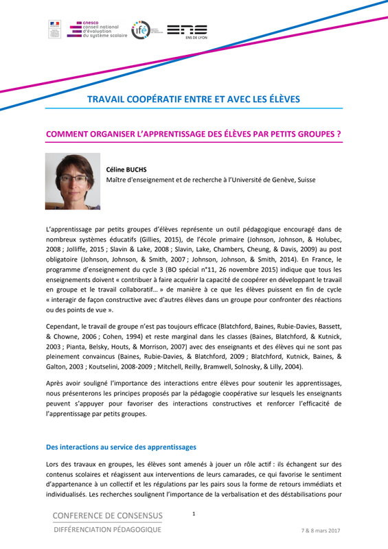 Le Cnesco a organisé, mercredi 17 janvier, sa deuxième conférence virtuelle interactive sur le thème de la différenciation pédagogique : Travail de groupes, tutorat… : comment faire travailler les élèves entre eux ? Cette conférence était animée par Nathalie Mons , présidente du Cnesco et professeure de sociologie à l’université de Cergy-Pontoise. Elle a fait intervenir : Céline Buchs , maître d’enseignement et de recherche à l’université de Genève et Yann Volpé , enseignant au primaire et chargé d’enseignement à l’université de Genève. La conférence se déroulait à l’ Éspé de Paris – Molitor : la première heure était consacrée à l’ état actualisé de la recherche , la seconde heure aux questions des acteurs de terrain . Cette conférence est réalisée en partenariat avec l’ Ifé/ENS de Lyon et l’ université Sorbonne Nouvelle – Paris 3 .